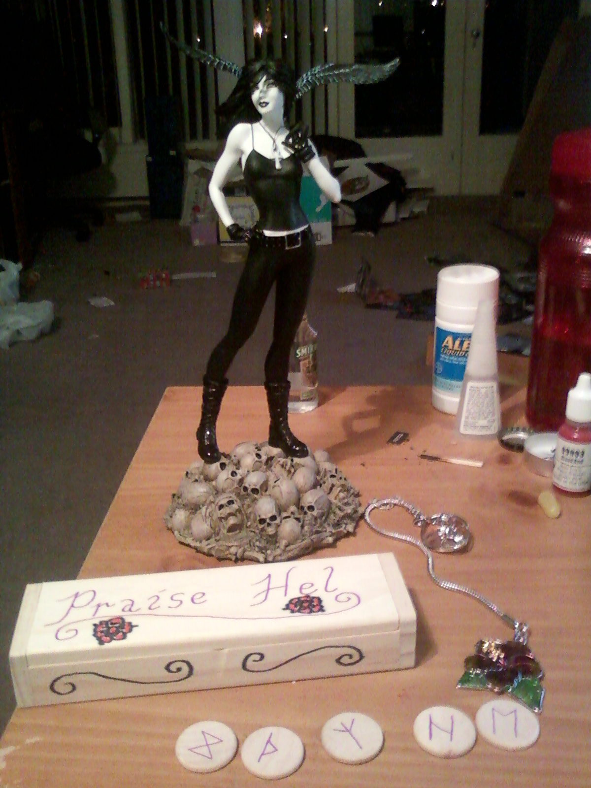 Hmmm… Clerics of Hel are very rare these days, and all things considered, I think there should be many more of them… How one wants to depict Hel is another matter, but then again, I find no blasphemy in “The Sandman” or “kid sister hel”. I think I shall even have to write a blog entry on the subject in my native swedish (my recent addiction is “asatru kitsch”) and offer my own fav pics and images of Hel – both those I made myself and Hel as envisioned by others…