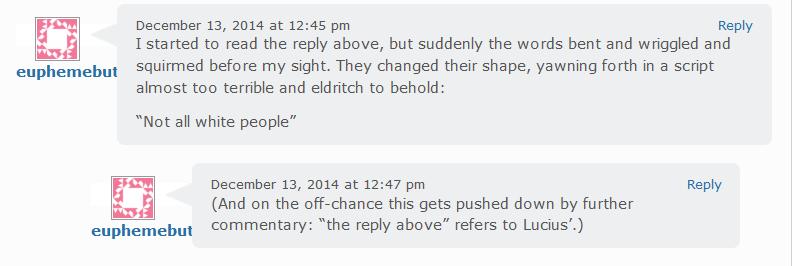 But I…I am an equalist. I hold everyone to the same standard, as eldritch and terrible to behold as it is. Because that’s what being equal is. Everyone is judged by the same standard, and if it is acceptable to damn all whites for the sins of people to whom most of us have no relation to and all of had no control over…then the only logical choice for me is that it is then acceptable, nay necessary to hold all people’s to that standard.