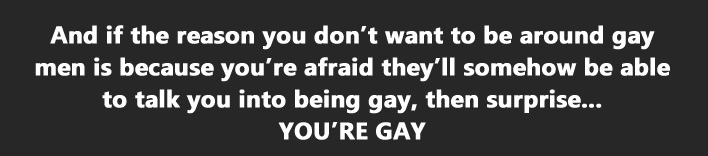 But even so, Homophobia isn’t even about being scared of Gay people. But I’ll get to that in a second.