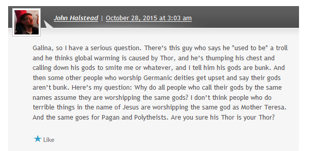 This is why back during the cultural appropriation articles, I showed, factually, Halstead had not “culturally appropriated.” Even though I dislike him as a person, believe him to be an idiot and a fanatic based on evidence presented by his own words, I can still separate man from argument and argument from man. That’s why I can, and do, respect Krasskova, Sarenth (sorry if I spelled that wrong), Rhyd, and, many others in the blog realms, even though I have often disagree with their arguments or positions.
