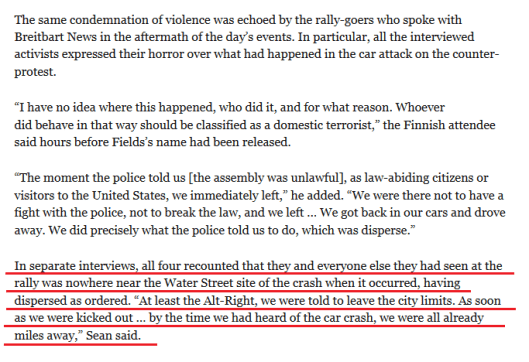 That’s right, by the time Kitt was slamming into Anti-Fa, the Alt-right had been banned from the city and ejected from the entire area by law enforcement. I don’t know why the “terrorist driver” was still in town, but by all accounts everyone else was gone. Which meant Anti-fa was not attacking the alt-right in their cars, they were attacking innocent civilians!