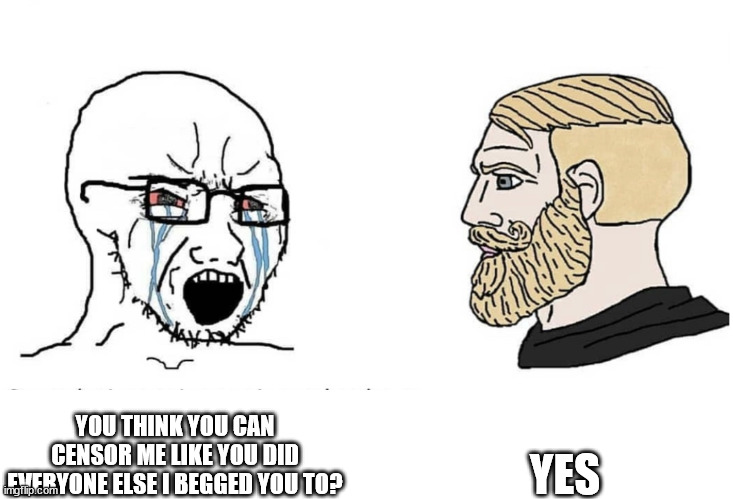 That’s why ‘conservatives’ and ‘right wing’ people get their channels suppressed or banned, their twitters banned (despite twitter being a fucking human right according to twitter itself, never mind the supreme court ruling), facebook accounts banned, their bank account canceled, their literary and comic book stories kicked off of crowd funding platforms, etc, etc, etc, and Mainer is happy for it to happen.