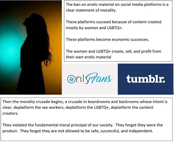 “Sex positive women, sex workers, LGBTQ+ people and those of non traditional gender expressions built the communities and the economic success of Tumblr and OnlyFans. In return, the received a safe space, community, affirmation, and economic control of their own content.“