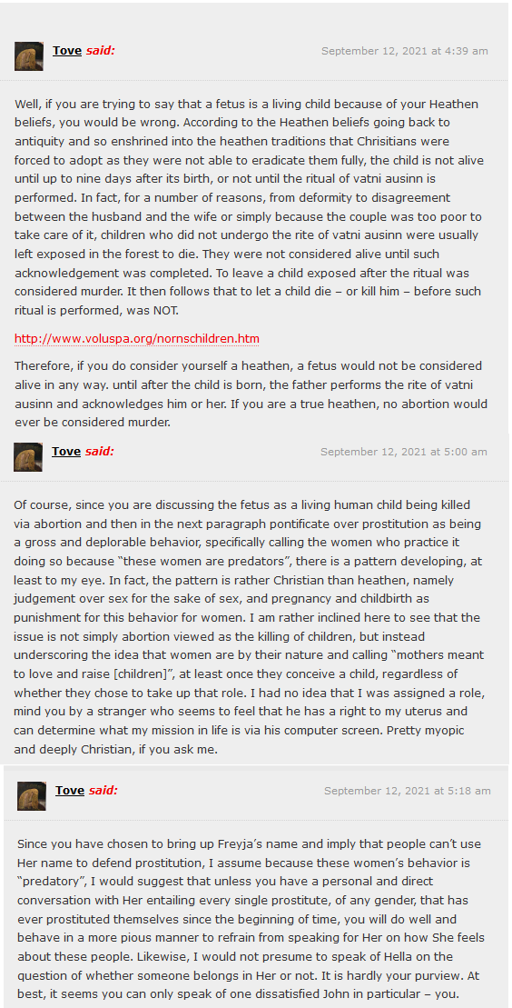 Tove speaks of piety, but they have only the piety that suits their whims. Where is Tove’s piety for the role of women (which she denies exists and believes she should not follow!)? Where is Tove’s piety for the keeping of slaves, of social order, or of killing for honor? Tove is happy to rely on the Christian ideals of equality, that men and women are the same and should possess the same political or legal rights, but woe that one should have the “christian” ideal that a woman not make herself a slut or cheat men from their money with her body through false practices! Where is Tove’s piety to the other Gods and Goddesses who scorn her views on sex, abortion, the roles of women and men, those who say her way is wrong?